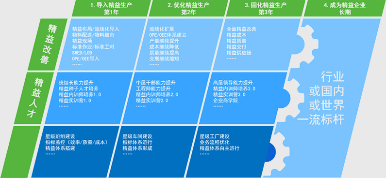 科理公司可以從精益改善、精益人才和精益體系三方面提供系統(tǒng)的、全面的咨詢服務(wù),幫助客戶分階段開展精益生產(chǎn)并持續(xù)改善,進(jìn)而幫助客戶成為行業(yè)或國內(nèi)或世界一流標(biāo)桿企業(yè)(可以根據(jù)客戶的實(shí)際情況,調(diào)整服務(wù)內(nèi)容的先后順序)。